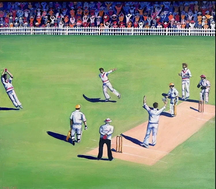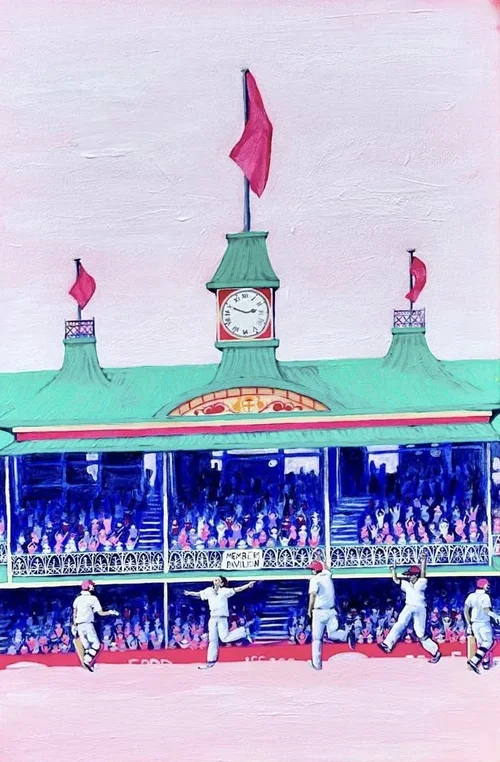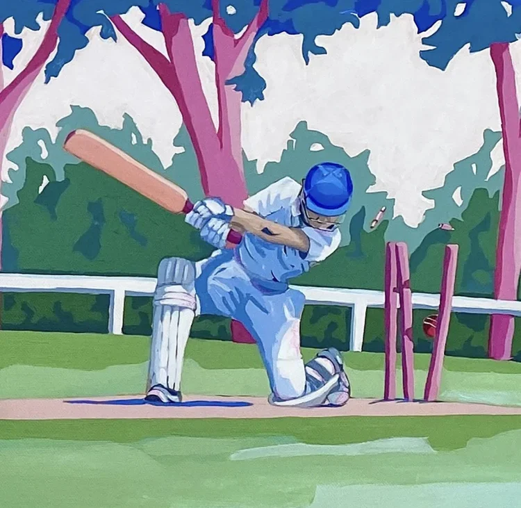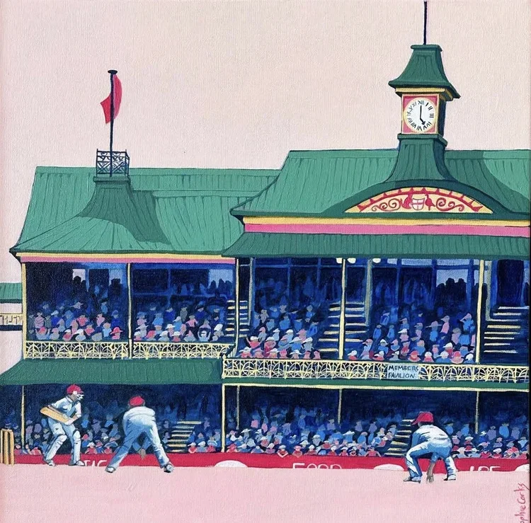 Based in Orange NSW, Sophie Corks is a contemporary artist who paints everyday observations of the Australian way of life with a unique perspective. Her colourful works are playful and whimsical and infused with nostalgia. Sophie loves to paint the domesticity of country cottages, postcard worthy rural villages and their historic buildings oozing character and charm. In her teenage years Sophie played schoolgirl cricket including a stint for NSW, so its no surprise that her love of the game would creep onto the canvas. From the humble backyard pitch to the hallowed SCG, her pieces are snapped up fast by Australian cricket lovers across the country.